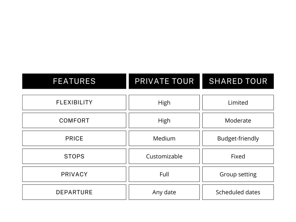 Shared tours generally cost less because transport and logistics are split among travellers.